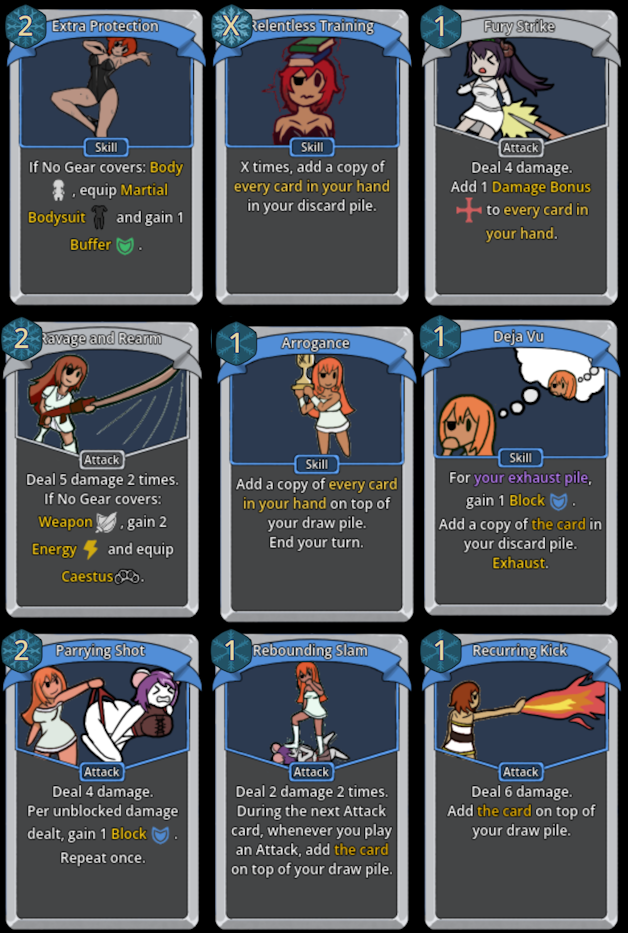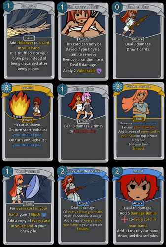 This Mod adds a new character, Willow, and 70+ new cards for her. She is a martial artist, and her cards center around adding damage buffs to cards in hand and copying your cards during combat, with a smaller focus on equipping and unequipping gear mid-combat.